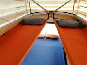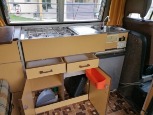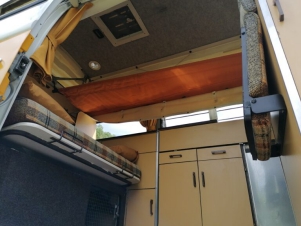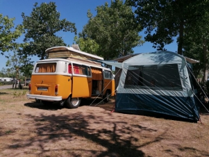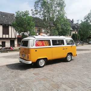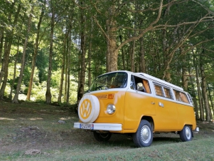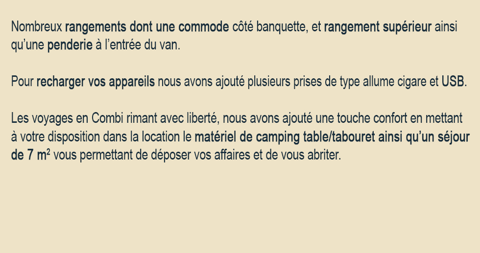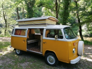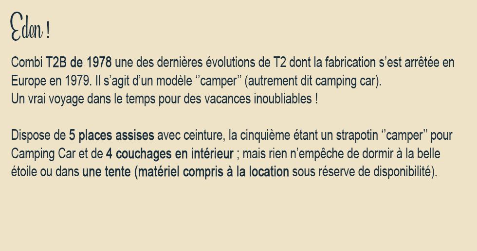 Je vous présente Eden! C’est un T2B de 1978 une des dernière évolution de T2 dont la fabrication s’est arrêtée en Europe en 1979. Il s’agit d’un modèle « camper »(autrement dit camping car). Un vrai voyage dans le temps pour des vacances inoubliables ! Eden dispose de 5 places assises avec ceintures, la cinquième est sur un strapotin. 2 places avant 2 places arrières sur banquette 5ème place strapontin « Camper » pour Camping Car , Eden dispose de 4 couchages en intérieur, mais rien ne nous empêche de dormir à la belle étoile ou dans une tente (matériel compris à la location sous réserve de disponibilité) La banquette se déplie pour offrir un lit 2 places de 120cm * 180cm. Le toit se réhausse de 60 cm afin de pouvoir déployer deux hamacs enfants de chaque côté . banquette 2 places adultes 2 Hamacs enfant jusqu’à 50kg par Hamac Pour la sécurité de vos enfants, vous avez la possibilité de fixer rapidement un filet garde corps adulte qui se glisse sous les hamacs Camper car Eden a son équipement cuisine avec Frigo qui fonctionne au 220v via la prise extérieur (rallonge electrique et adaptateur fournis dans la location). Dans un soucis permanent de sécurité, un disjoncteur différentiel à été ajouté au raccordement 220v qui permet uniquement au frigo de fonctionner. Bloc cuisine Au dessus vous trouverez un évier inox très pratique avec bouton poussoir d’arrivée d’eau électrique et d’origine ! Deux plaques de cuisson au gaz sont présentent et fonctionnent. Néanmoins,nous savons par expérience qu’il est plus agréable de cuisiner à l’extérieur. C’est pour cela que nous fournissons dans la location un réchaud à gaz avec ses recharges pour profiter des moments en extérieur et garder la qualité de l’espace nuit Le nécessaire de cuisine est également fourni à la location et comprend également une bouilloire électrique. Cette version Devon offre de nombreux rangements dont une commode côté banquette, et rangement en hauteur, également une penderie à l’entrée du van. Pour recharger vos appareils nous avons ajouté plusieurs prises de type allume cigare et usb Les Voyages en Combi rime avec liberté et nous avons souhaité ajouté une touche confort en mettant à votre disposition dans la location le matériel de camping table tabouret et également séjour de 7 m2 afin de pouvoir déposer ses affaires et s’abriter.