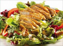 POULET : salade verte, tomates, poulet, pommes de terre, olives.
